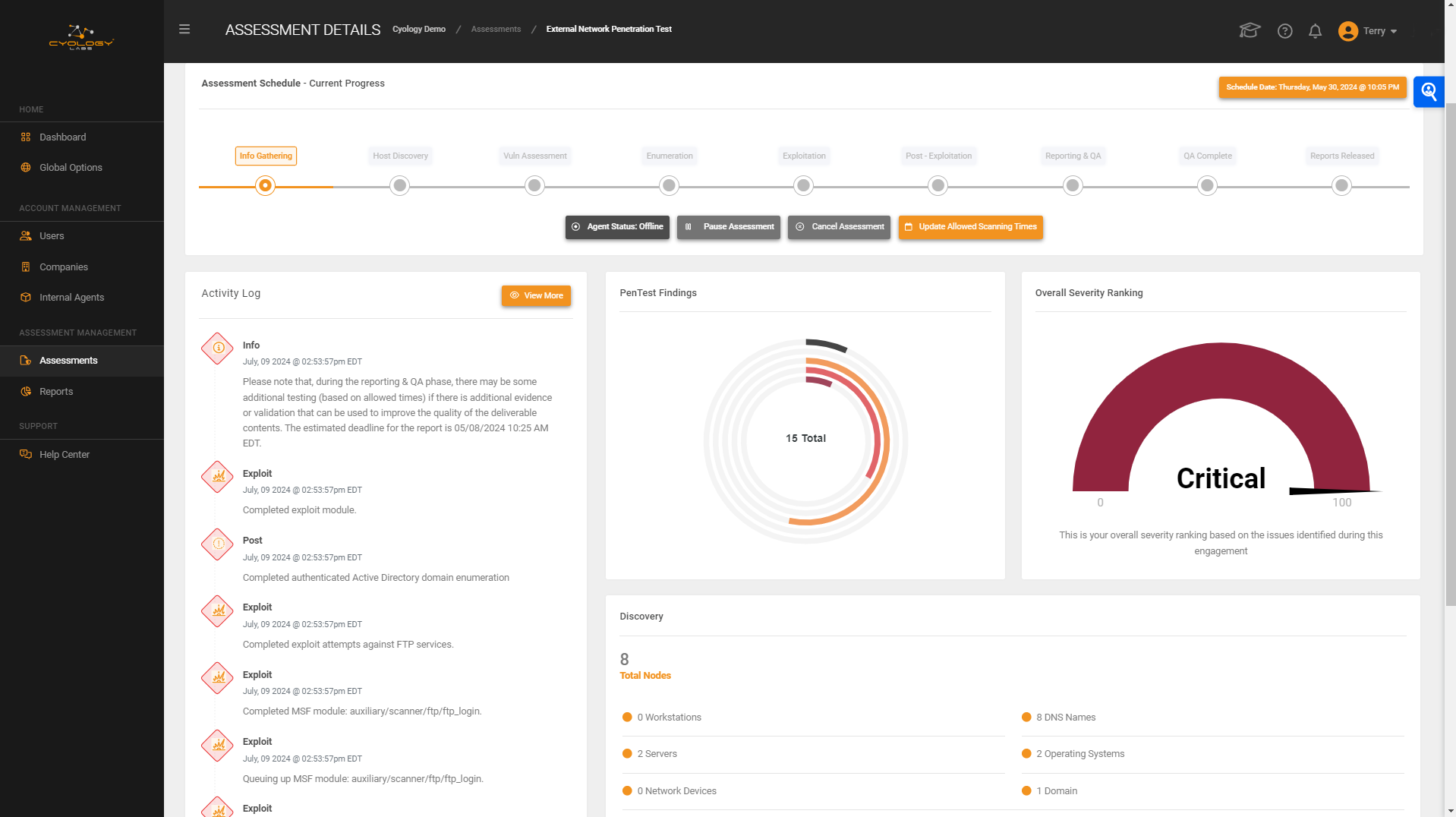 Traditional assessments often provide only a point-in-time snapshot of an organization's security environment. At Cyology Labs, we offer continuous risk management solutions. Our platform enables monthly or on-demand security assessments, allowing organizations to efficiently conduct comprehensive evaluations. This approach measures the effectiveness of compensating controls through advanced exploitation techniques while minimizing risks by implementing strategic controls.