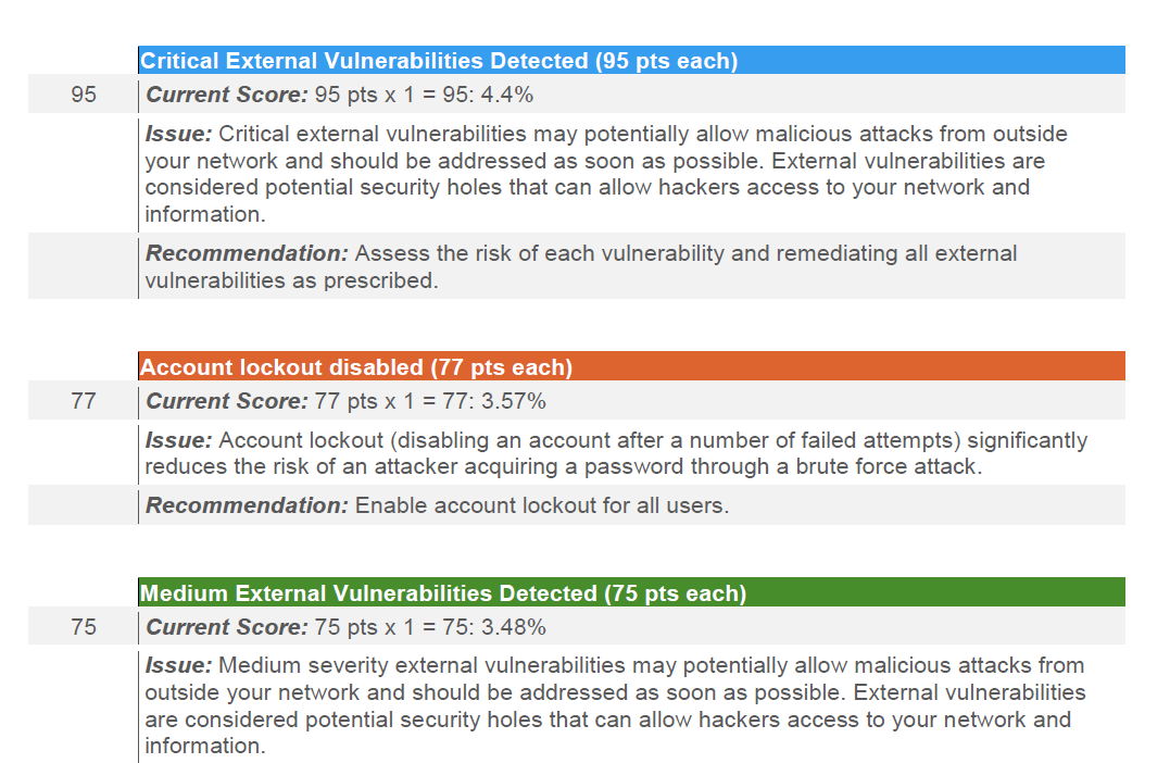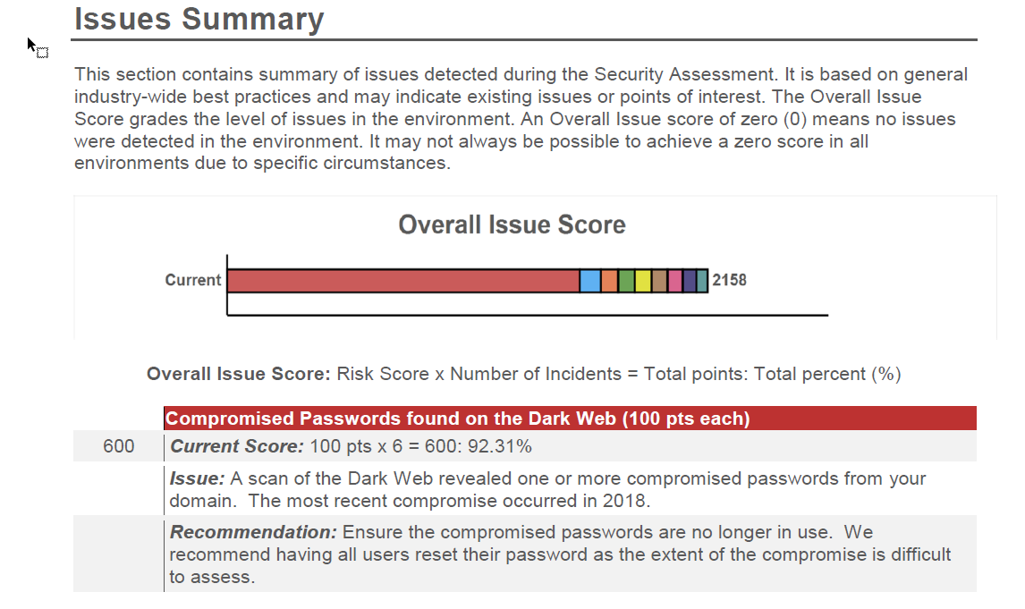 The Security Risk report is your proprietary Risk Score and chart which shows the relative health of your network security, along with a summary of the number of computers with issues. This powerful report also details outbound protocols, system control protocols, user access controls, external vulnerabilities summary, and dark web password and credential breaches.